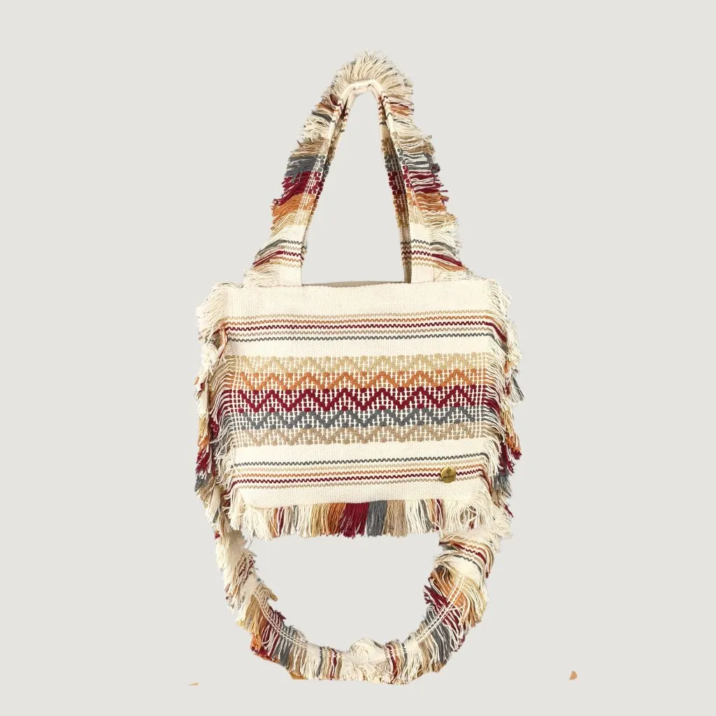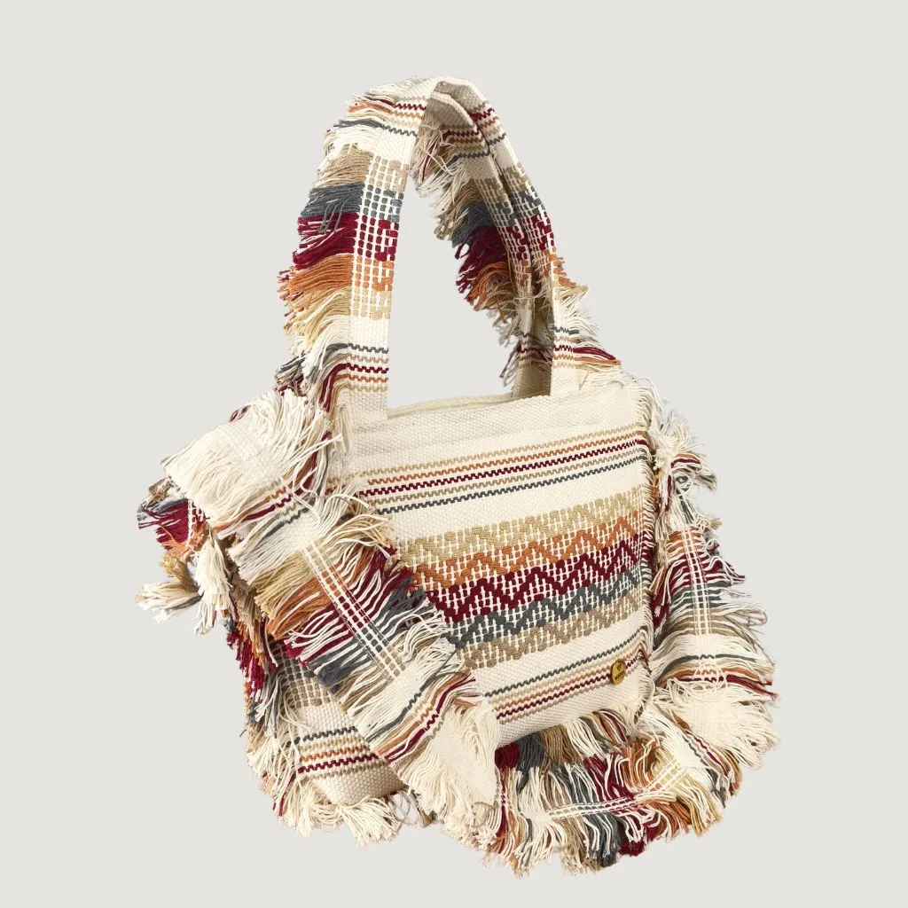 Sus flecos danzantes y patrones geométricos ancestrales nos recuerdan que llevamos con nosotros un pedazo de historia viva, mientras su diseño contemporáneo abraza el presente.