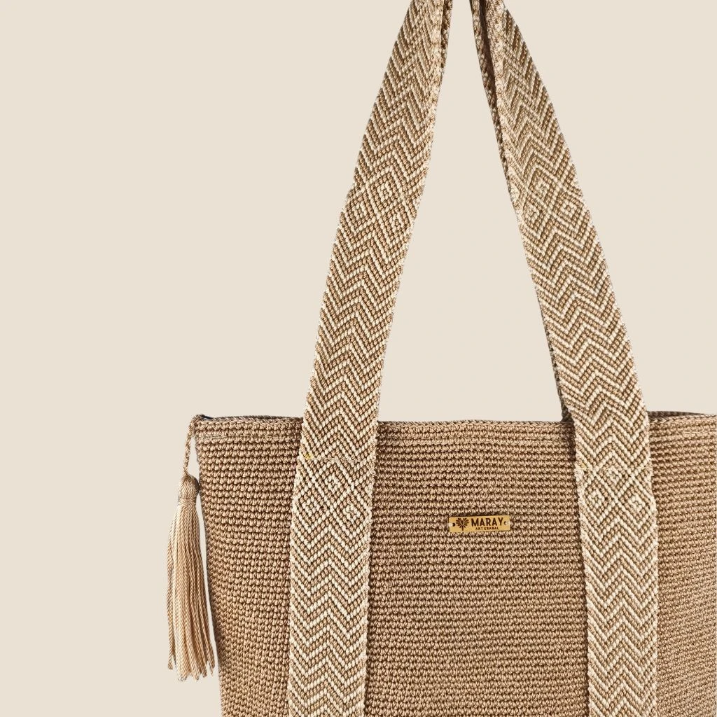 Los puntos están bien unidos y la tensión del tejido es uniforme, lo que indica la calidad de la elaboración artesanal. Se observa un tejido a mano meticuloso, con un patrón de chevron en las asas que le da un toque único.