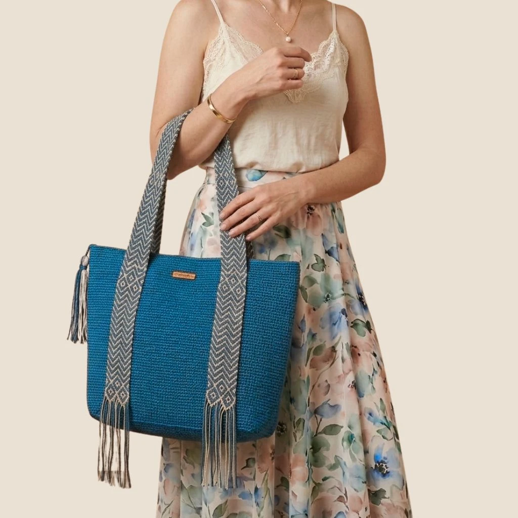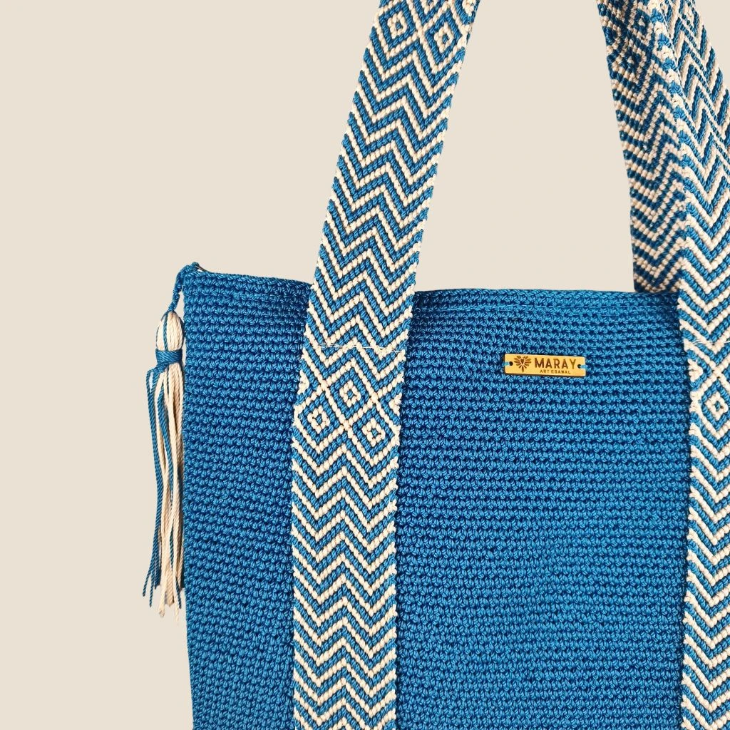 Los puntos están bien unidos y la tensión del tejido es uniforme, lo que indica la calidad de la elaboración artesanal. Se observa un tejido a mano meticuloso, con un patrón de chevron en las asas que le da un toque único.