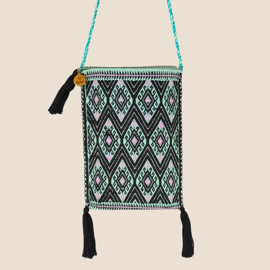 Bolsa Portacelular, bandolera rectangular con brocado hecho a mano elaborado en telar de cintura por una comunidad de artesanas en Chiapas, México.