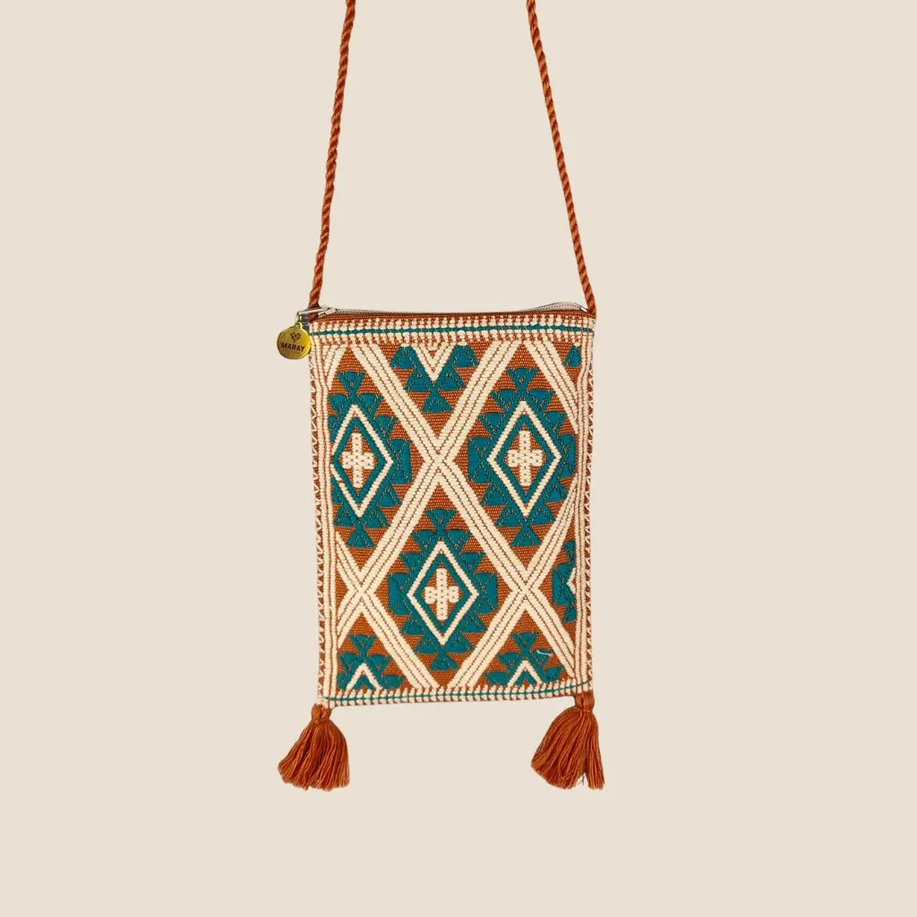 Bolsa Portacelular, bandolera rectangular con brocado hecho a mano elaborado en telar de cintura por una comunidad de artesanas en Chiapas, México.