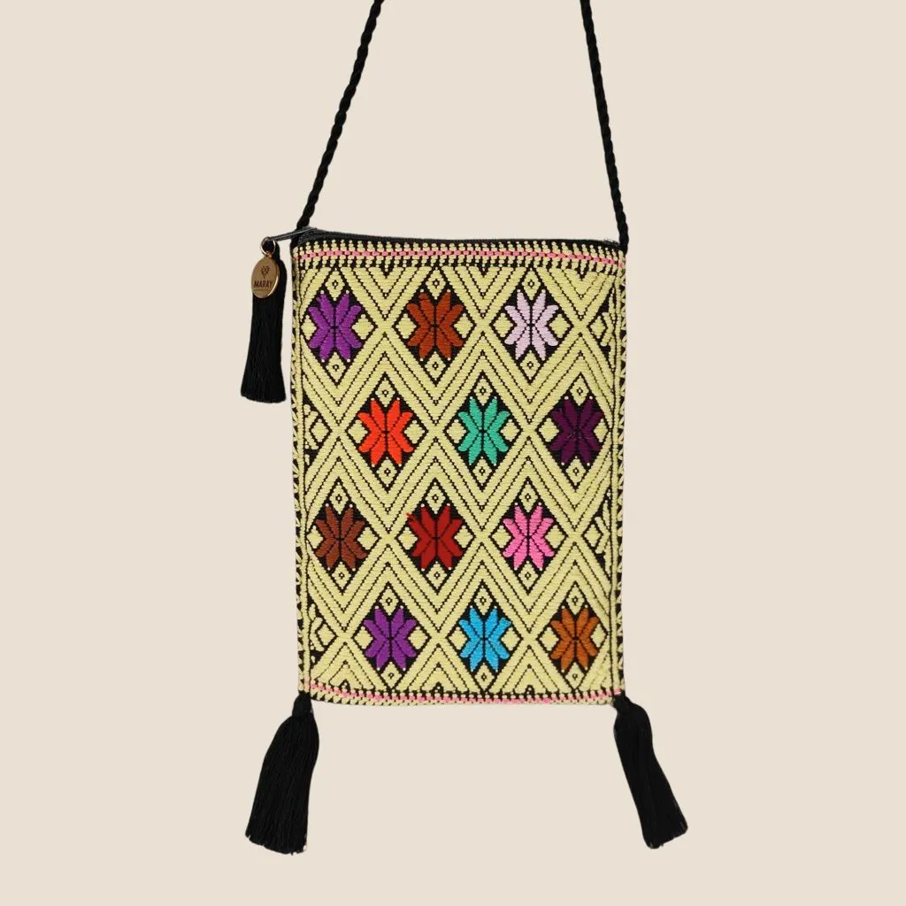 Bolsa bandolera rectangular con brocado hecho a mano elaborado en telar de cintura por una comunidad de artesanas en Chiapas, México.