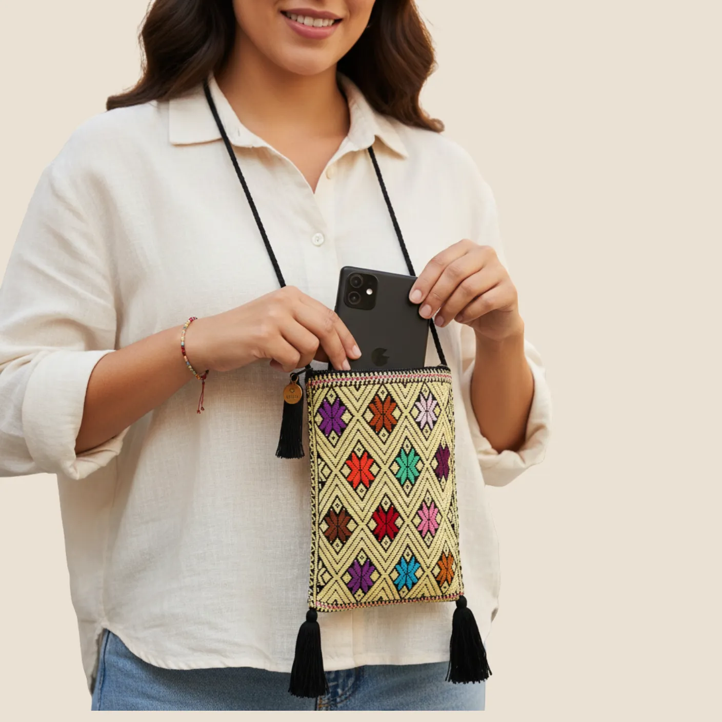 Bolsa Portacelular, bandolera rectangular con brocado hecho a mano elaborado en telar de cintura por una comunidad de artesanas en Chiapas, México.