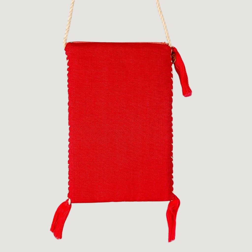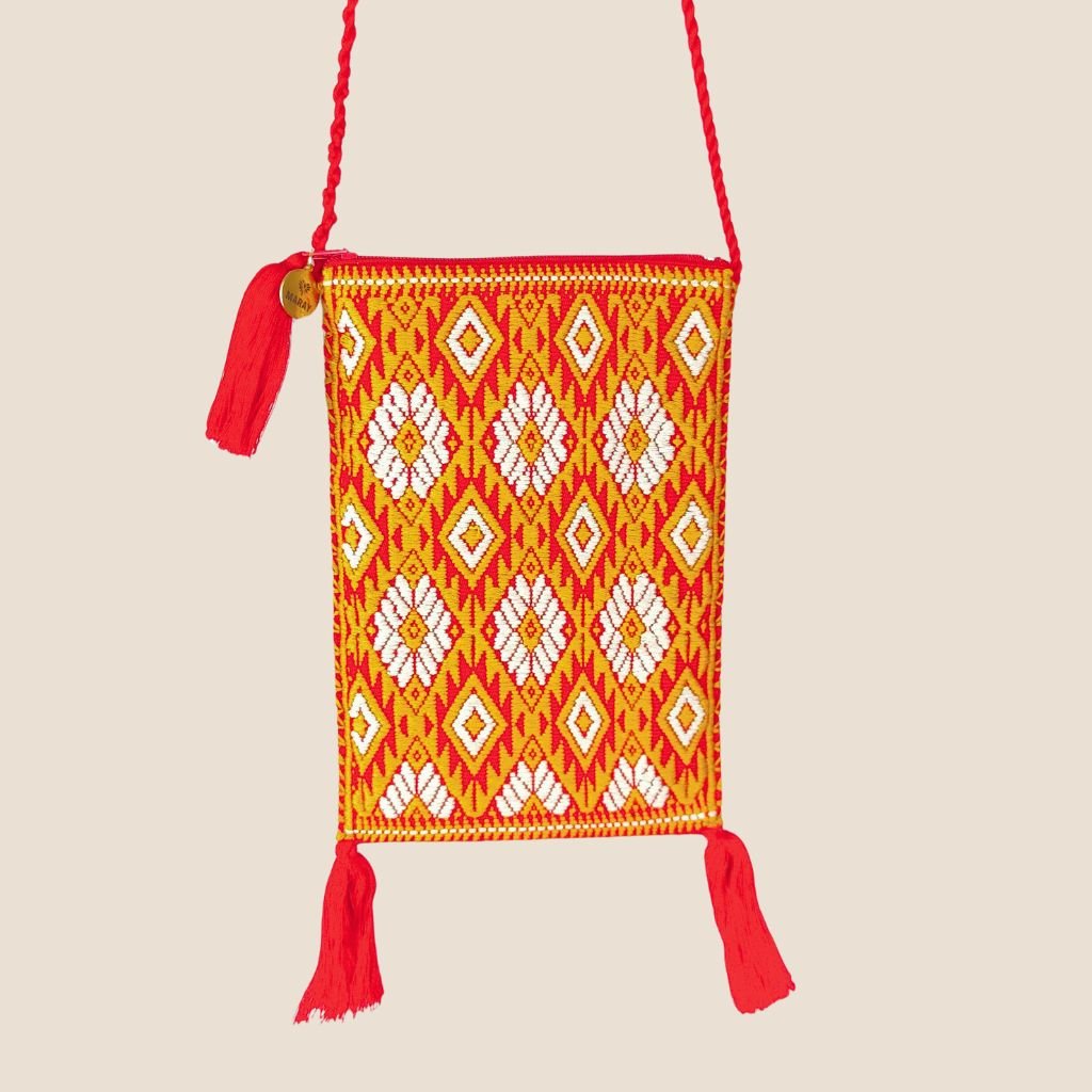 Bolsa Portacelular, bandolera rectangular con brocado hecho a mano elaborado en telar de cintura por una comunidad de artesanas en Chiapas, México.