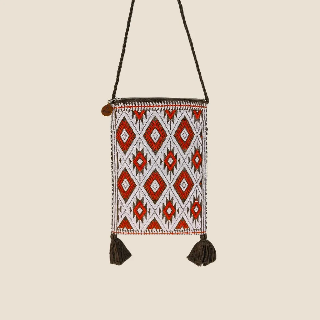 Bolsa bandolera rectangular con brocado hecho a mano elaborado en telar de cintura por una comunidad de artesanas en Chiapas, México.