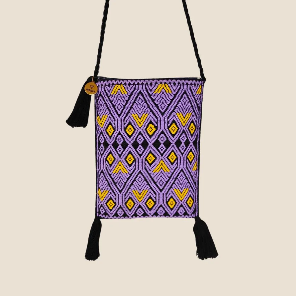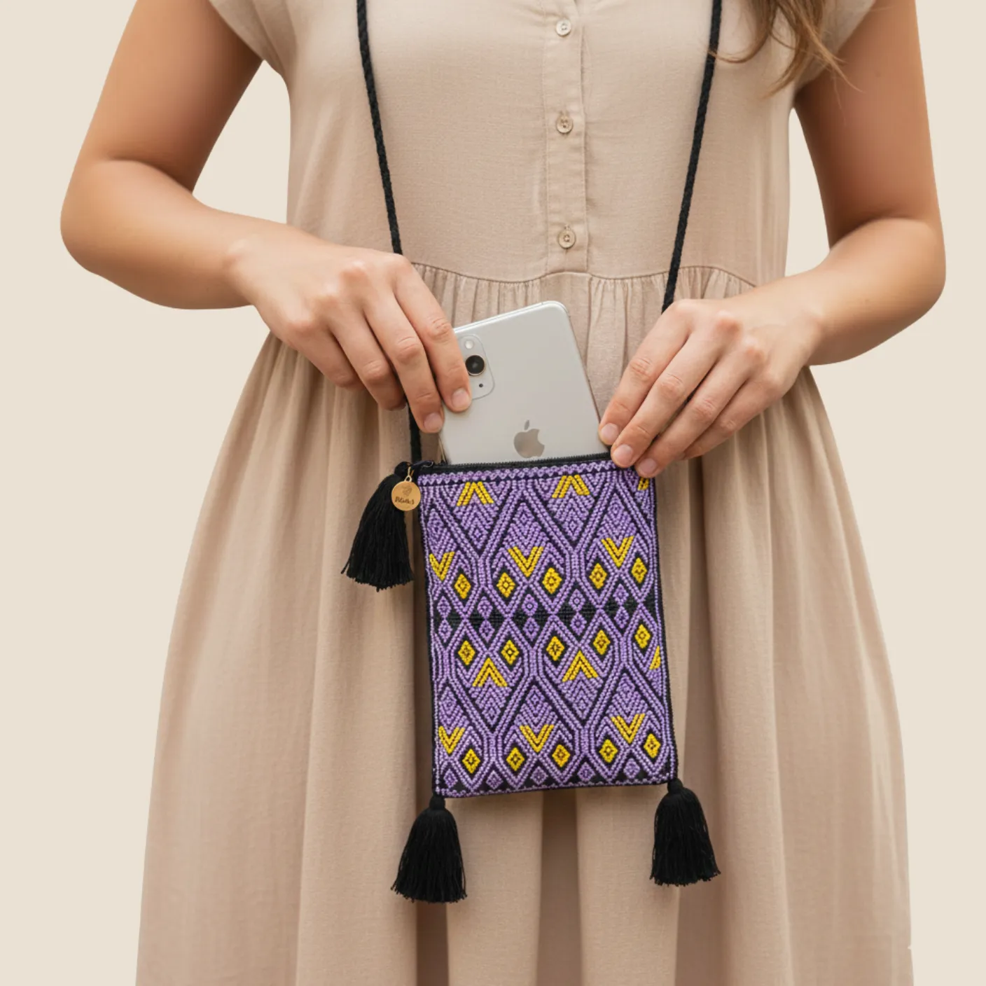 Bolsa Portacelular, bandolera rectangular con brocado hecho a mano elaborado en telar de cintura por una comunidad de artesanas en Chiapas, México.