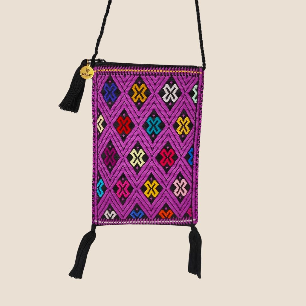 Bolsa Portacelular, bandolera rectangular con brocado hecho a mano elaborado en telar de cintura por una comunidad de artesanas en Chiapas, México.