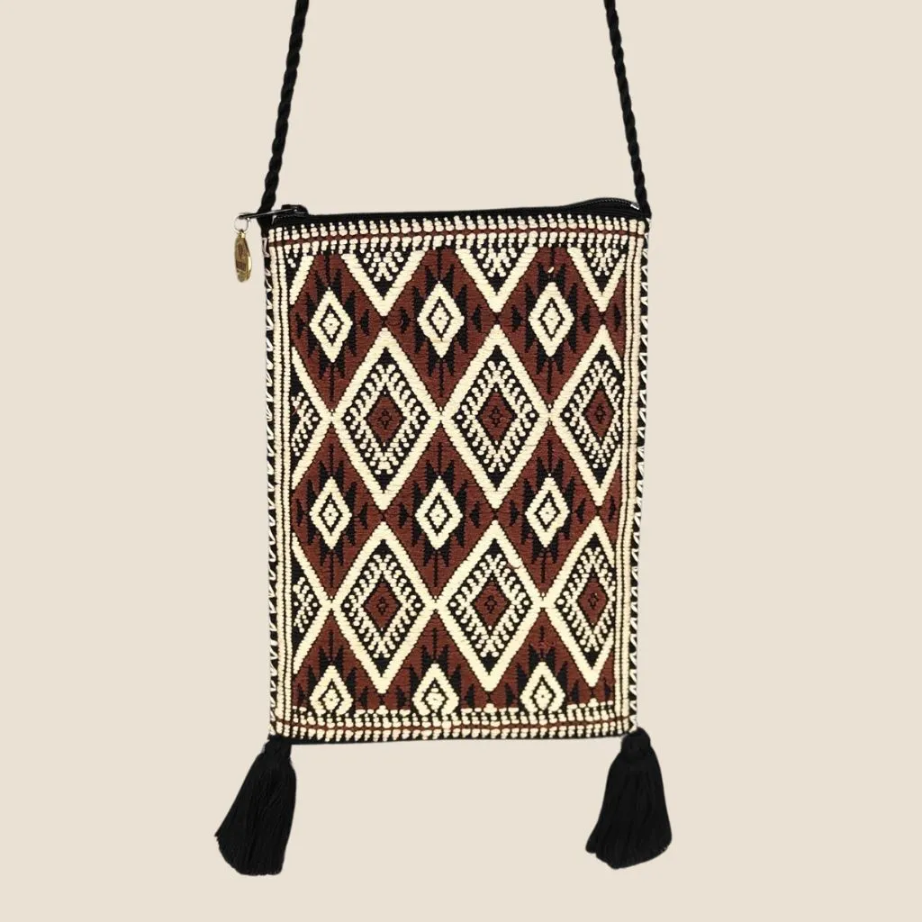 Bolsa Portacelular, bandolera rectangular con brocado hecho a mano elaborado en telar de cintura por una comunidad de artesanas en Chiapas, México.