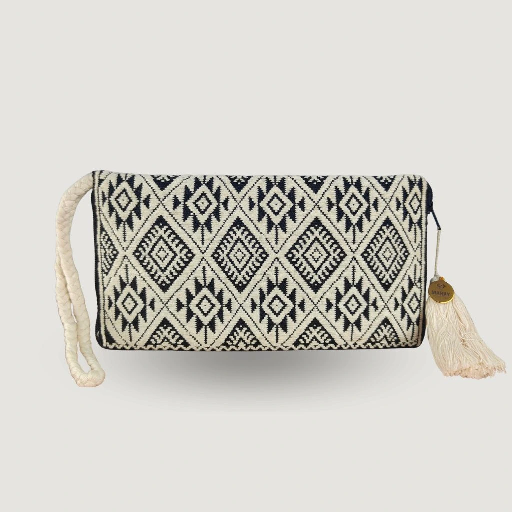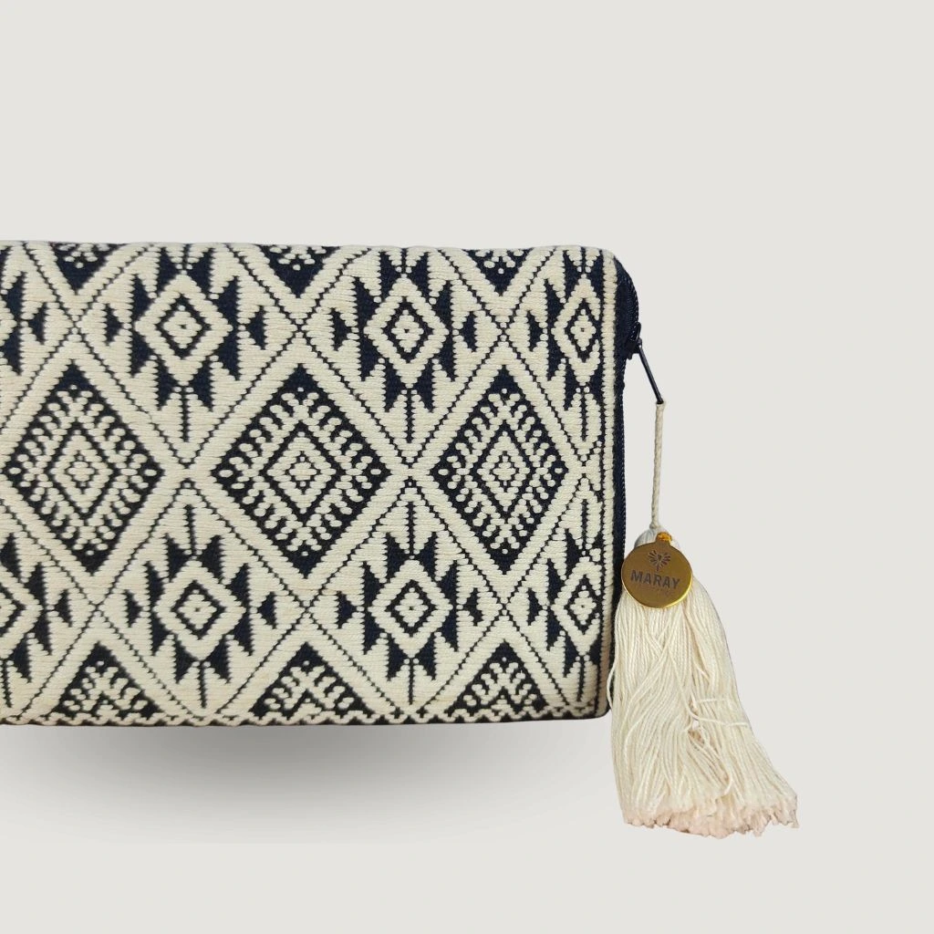 Cartera con brocado hecho a mano elaborado en telar de cintura por una comunidad de artesanas en Chiapas, México.