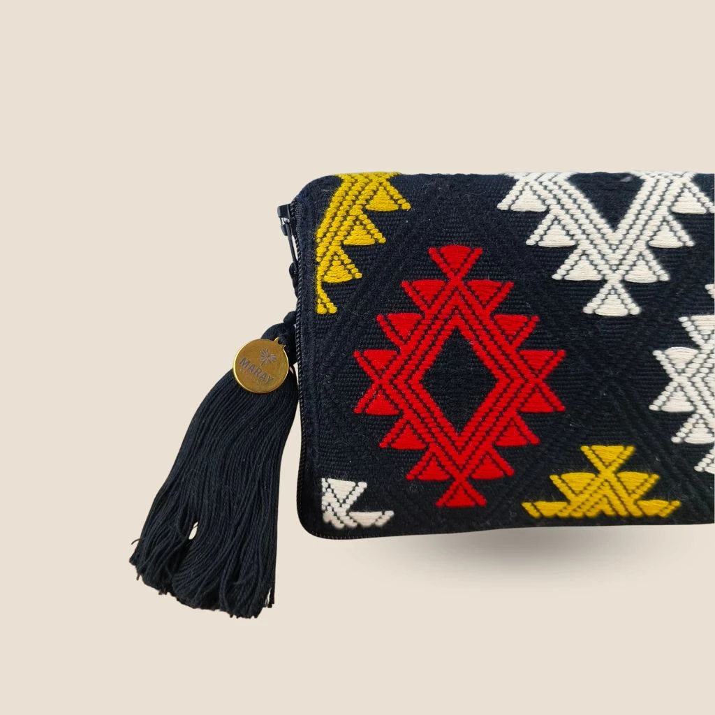 Cartera con brocado hecho a mano elaborado en telar de cintura por una comunidad de artesanas en Chiapas, México.