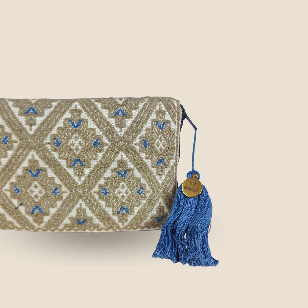 Cartera con brocado hecho a mano elaborado en telar de cintura por una comunidad de artesanas en Chiapas, México.