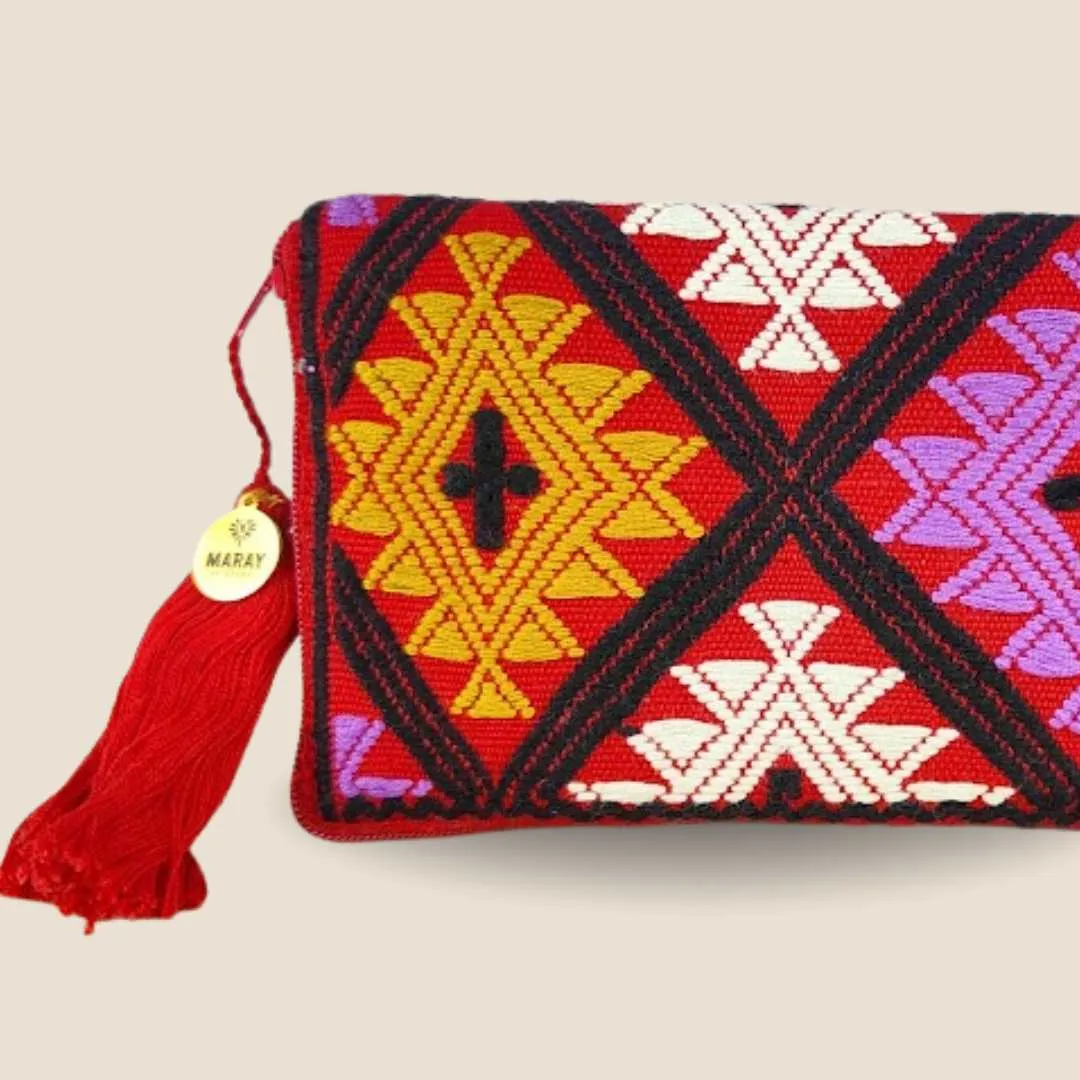 Cartera con brocado hecho a mano elaborado en telar de cintura por una comunidad de artesanas en Chiapas, México.