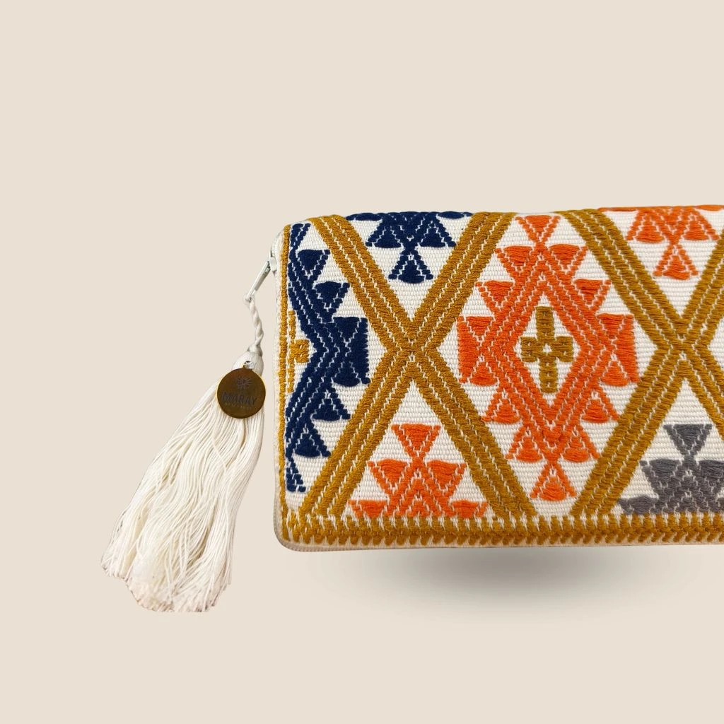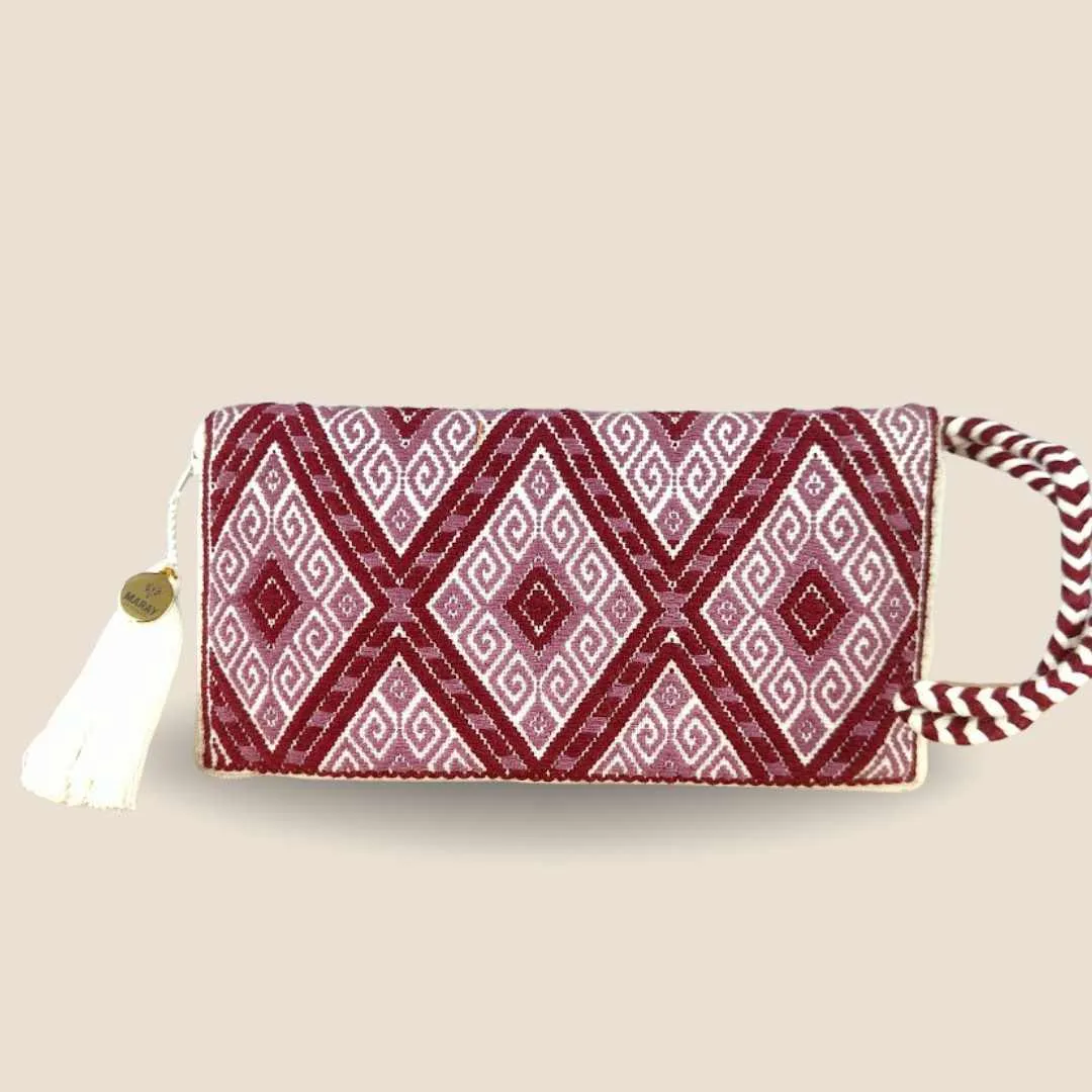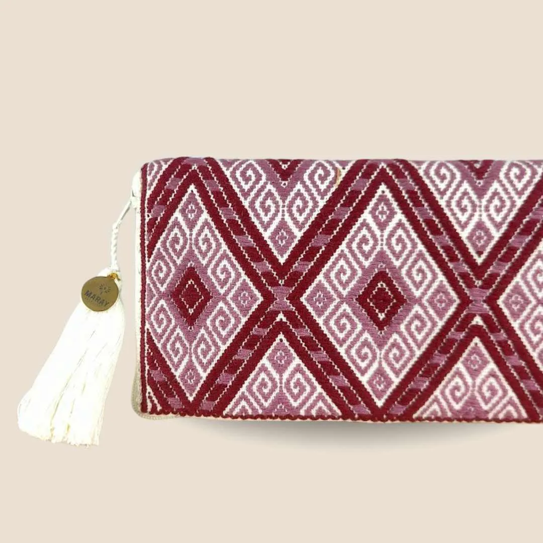 Cartera con brocado hecho a mano elaborado en telar de cintura por una comunidad de artesanas en Chiapas, México.