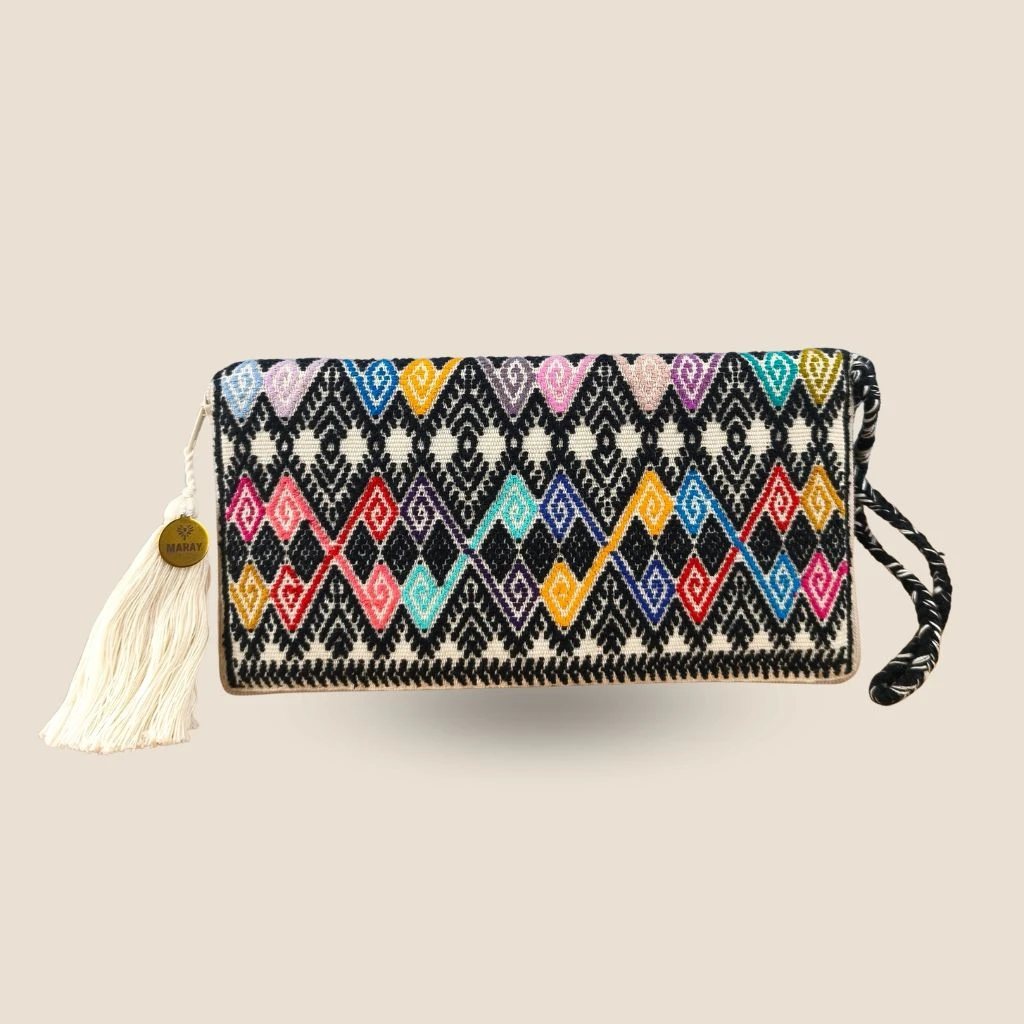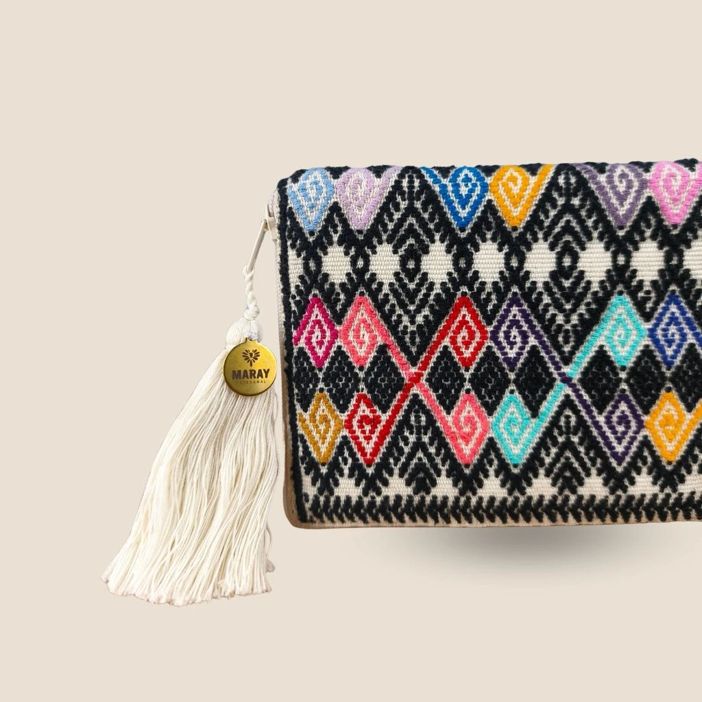 Cartera con brocado hecho a mano elaborado en telar de cintura por una comunidad de artesanas en Chiapas, México.
